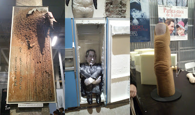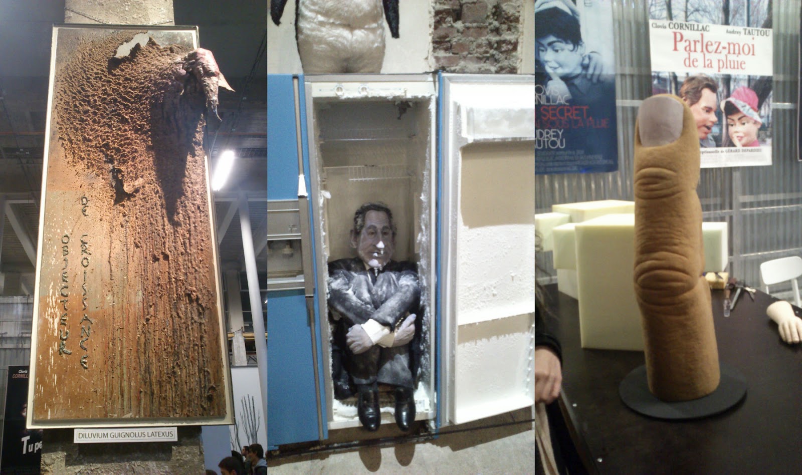Beim linken Bild handelt es sich um die Latexrückstände auf dem Boden, die beim Herstellungsprozess mit der Zeit herunter getropft sind und diese Skulptur erschaffen haben. Das ganze wurde gerahmt und dort gezeigt. In der Mitte ist ein gefrorener Sarko zu sehen und rechts, nun ja, ein Finger.