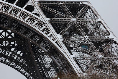 Leider hat es die ganze Nacht hindurch geregnet, so dass das stundenlange Warten in den Schlangen vor den Eingängen der einzelnen Ausstellungen dieses Jahr noch weniger Spaß gemacht hat als sonst. Nur der Eiffelturm sah ganz gut aus, wie er mit der Spitze so in den Regenwolken hing.