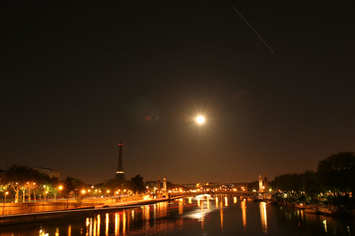 Eigentlich wollte ich nur die Internationale Raumstation fotografieren, wie sie über den Nachthimmel von Paris fliegt (oben rechts).