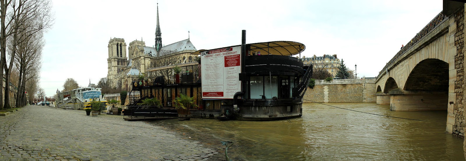 Jetzt kann man nicht mehr durchgängig am Ufer entlang gehen, da in der Regel unter den Brücken Land unter herrscht. Auch dieses Restaurantboot ist nur noch gerade so zu erreichen, es liegt eigentlich an einer Kaimauer, die jetzt nicht mehr zu sehen ist. Die Überflutung war aber eine Maßnahme mit Ansage. Bereits vor einer Woche wurden die Anlieger gefährdeter Gebiete aufgefordert, ihre Sachen in Sicherheit zu bringen.