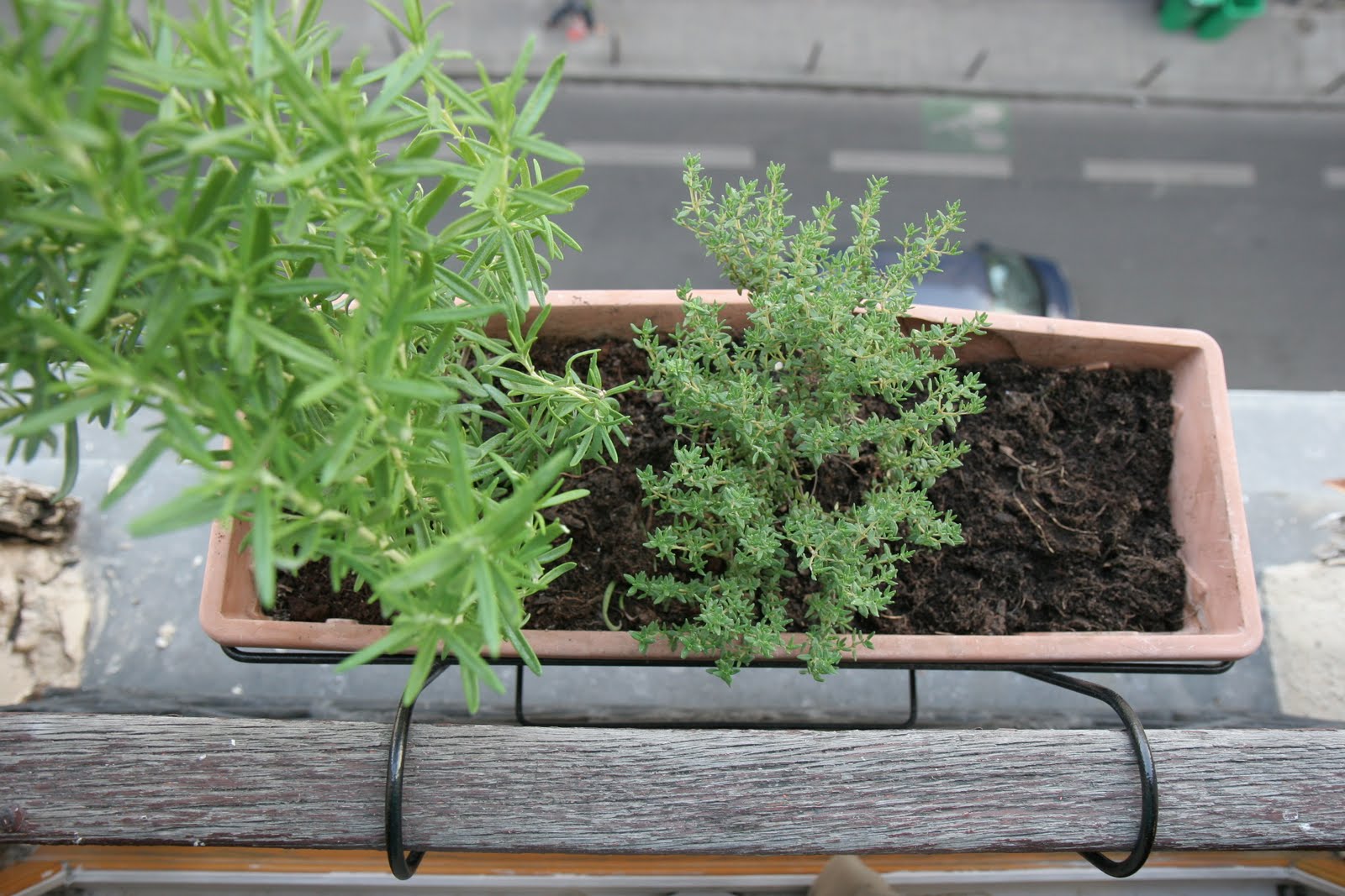 Ich hatte ja berichtet, dass für den Inhalt eines Blumenkastens keinerlei Hoffnung mehr bestand. Dieser wurde nun gerodet. Im Supermarkt um die Ecke wurden zwei Kräutertöpfe mit Thymian und Rosmarin besorgt und eingepflanzt. Das Ergebnis kann sich sehen lassen.