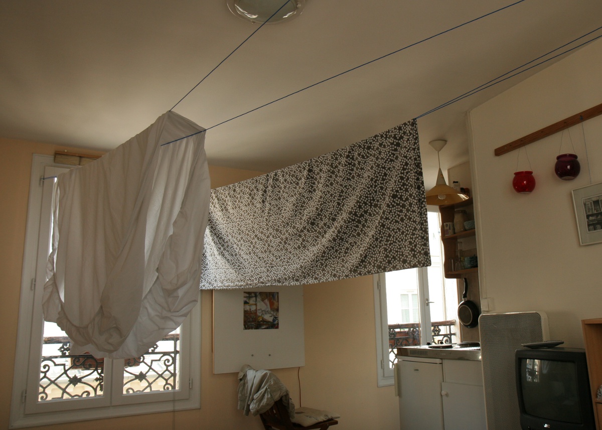 Ein Stehplatz findet sich ja bekanntlich auch in jeder noch so vollen Kneipe* und auch in meiner kleinen knapp 20 m² "großen" Wohnung findet sich Platz zum Wäschetrocknen. Heute habe ich ausprobiert, durch meine Wohnküche 4 Wäscheleinen zu spannen. Hat geklappt! Ich brauchte zwar gar nicht soviel Platz, aber man weiß ja nie.