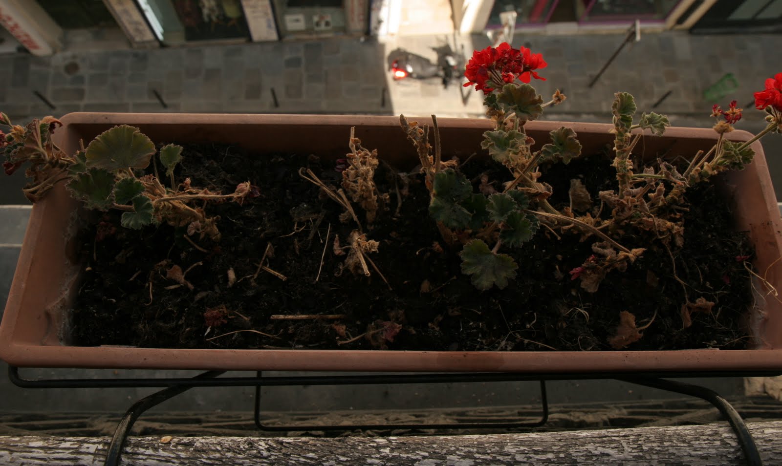 Ich habe ein neues Hobby! Meine Wohnung hat drei Fenster mit jeweils einem Blumenkasten. Unter vielen Schichten vertrockneten Unkrauts habe ich die Überreste von Geranien gefunden. Ich habe mich dafür entschieden, zunächst das Unkraut zu entfernen.