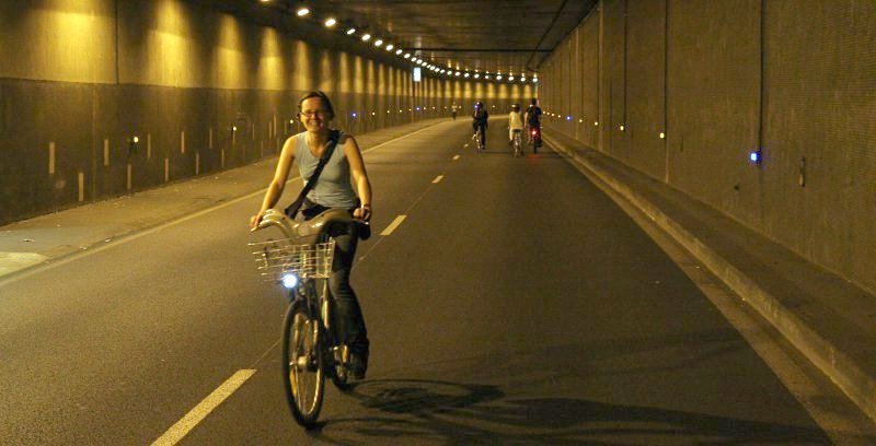 Also, die Seine fließt ja in Paris durch ein ziemliches Betonbett, meistens gesäumt von großen Straßen und viel Verkehr. Nicht so am Sonntag: da werden diese Straßen für den Autoverkehr gesperrt und Radfahrer und Fußgänger können sich die Seineufer zurückerobern. Das haben Anne und ich auch getan und sind mit dem Velib dort unterwegs gewesen. Auch einen ziemlich langen Straßentunnel kann man so erkunden. So ist folgendes Foto mit einem für Paris nicht ganz touristischem Hintergrund entstanden.