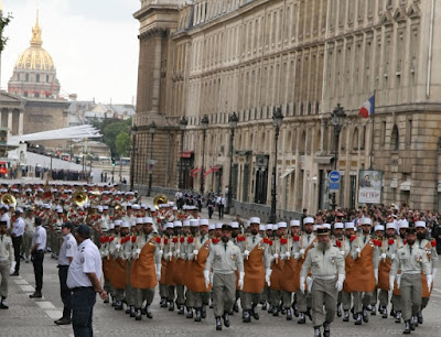 Wir haben uns dann an den Straßenrand bei der Madeleine gestellt. Das war ein Abschnitt nach dem offiziellen Ende, die Parade war dort schon aufgefächert und man hat nur noch ungefähr die Hälfte gesehen, das hat aber auch gereicht. Der Vorteil war, dass es nicht so überfüllt war und man auch schneller wieder flüchten konnte. Also haben wir uns ein paar Kompanien marschierende Soldaten angeguckt. Die bemerkenswertesten waren diese Sappeure hier, verfolgt von einem Orchester mit gut zu erkennenden Sousaphonen (Gruß an Anne):