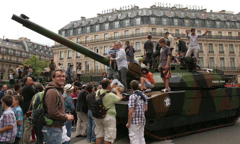 Nachdem das Marschieren vorbei war, sind wir dann eine Straße entlang, in der sich die abziehenden Panzer stauten, die wir dann noch ein wenig aus der Nähe beäugen konnten. Später am Tag wurden dann noch diverse Militärfahrzeuge im Stadtgebiet abgestellt und konnten von der ganzen Familie bestiegen und erkundet werden. Hier ein paar Panzer im Getümmel vor der Opéra Garnier (die leider auf dem Bild nicht zu sehen ist, weiter rechts):