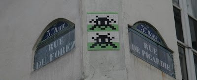 An vielen Häuserecken findet man mehr oder weniger große Mosaiken mit Pixel-Figuren aus dem Spiel Space Invader. Die nehmen praktisch die Stadt ein. Auch andere Städte werden inzwischen eingenommen, aber Paris ist die "most invaded city".