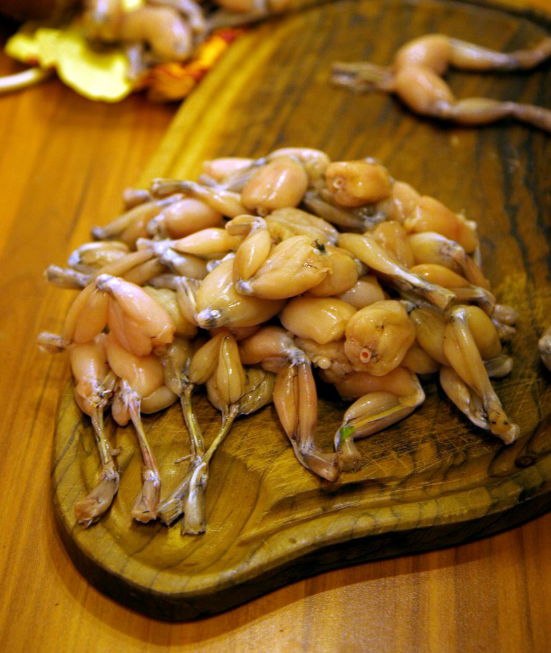 In dieser Form gibt es sie frisch zu kaufen und nachdem man Krallen und Wirbelsäule abgeschnitten hat, kann man sie dünsten und mit Püree servieren. Dazu beispielsweise ein Riesling. Der Geschmack geht in Richtung Hühnchen mit einem Beigeschmack Dorsch. Man hat sehr viel zu Nagen und zu Pulen. Für all jene, die gerade keinen Froschhändler in der Nähe haben, sei gesagt, dass eingefrorene Exemplare nicht sehr gut schmecken. Von denen haben wir auch ein paar probiert.